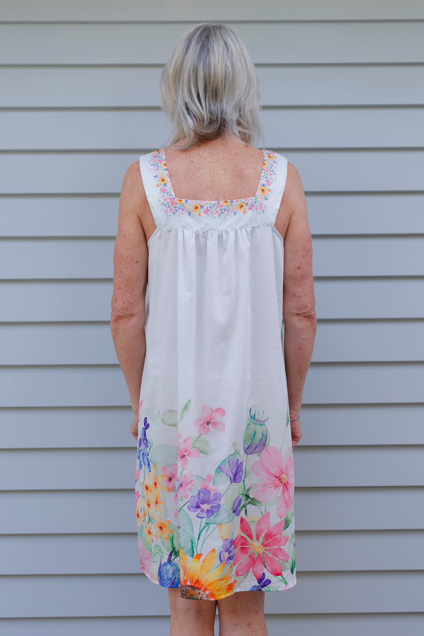 The Carmen Kirstein Cotton Lady nightie features wide straps and a flattering V-neck front detailed with delicate pin tucks. Gathered across the back for a comfortable fit, it is crafted from 100% cotton in New Zealand. The nightie showcases a beautiful floral garden print highlighting vibrant sunflowers, combining comfort with timeless elegance.